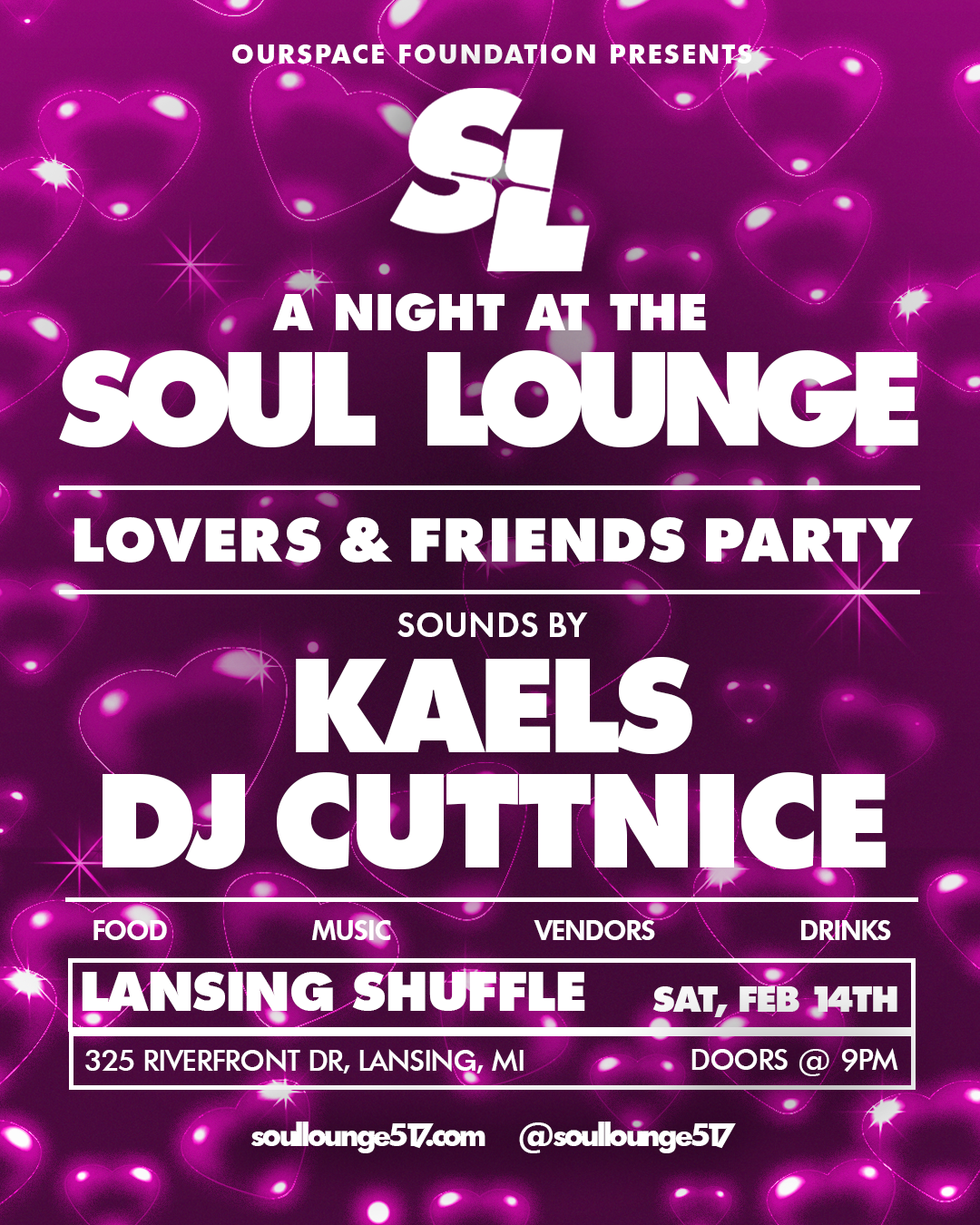 Join us for a special Valentine’s Day edition of A Night at the Soul Lounge, themed Lovers & Friends, on Friday, February 14 from 9PM–2AM at Lansing Shuffle.